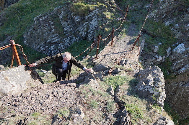The promontory is actually quite spacious. I'll post some pics to try to represent that, but it is hard to see because the promontory is made up of about 4 plateaus with steep drops down to each one, so they are rather hidden whether you look up or down. I have no idea how anyone built a castle here! I also can't quite imagine how large retinues traveled here. For instance, in 1503 Margaret Tudor, the sister of King Henry VIII of England, spend the night here on her way to Edinburgh to marry King James IV of Scotland. I know horses are sure-footed, but I imagine if they came overland that Princess Margaret would have been in a carriage of some sort, as would her ladies in waiting, and this is very steep terrain. It's more likely at that time that they would have come by sea, but I don't know how they would have gotten up to the castle along these sheer cliffs. (Mary, Queen of Scots, also stayed here for a time in 1566.)